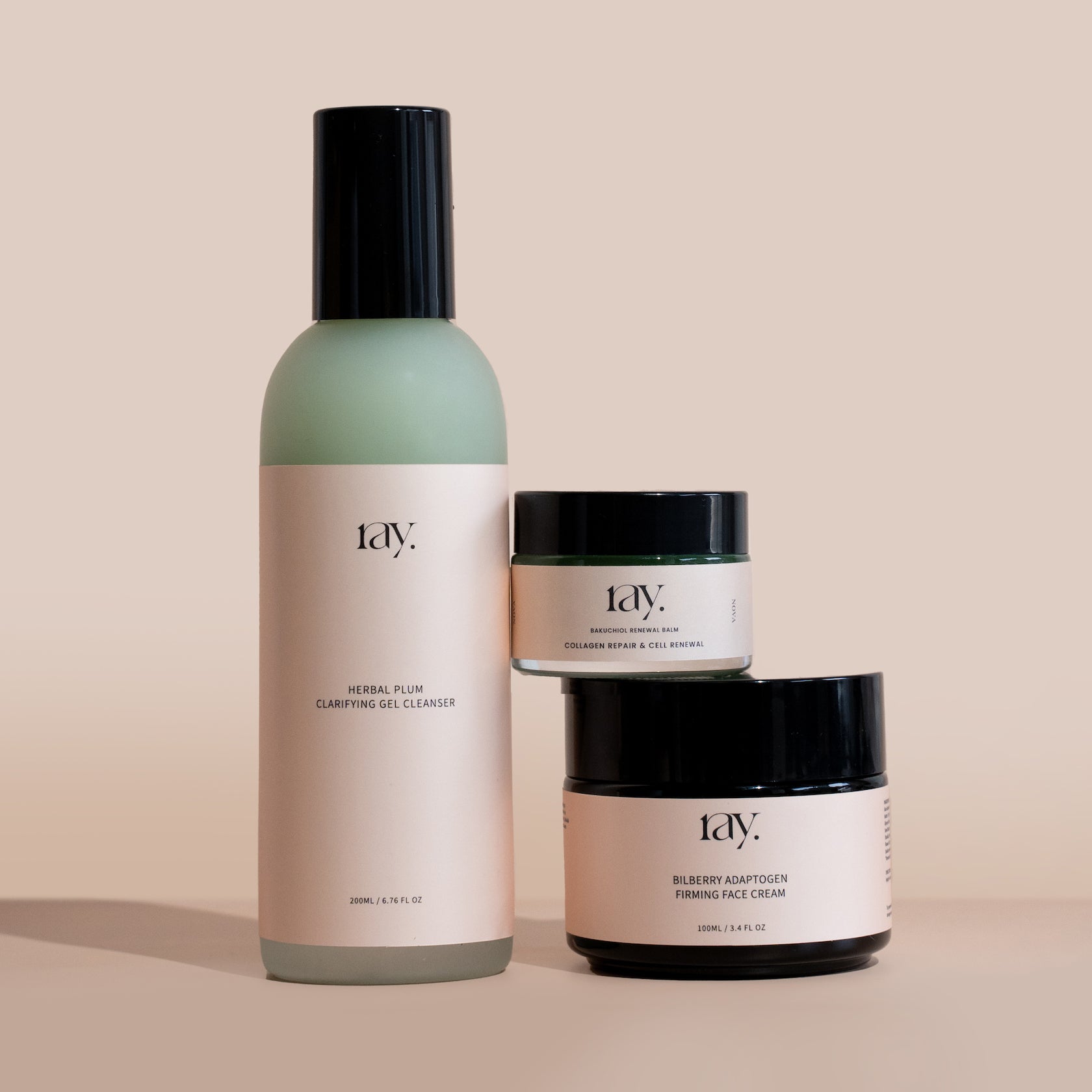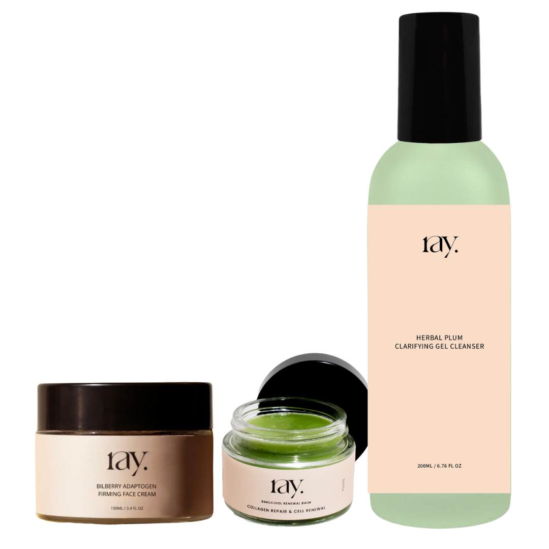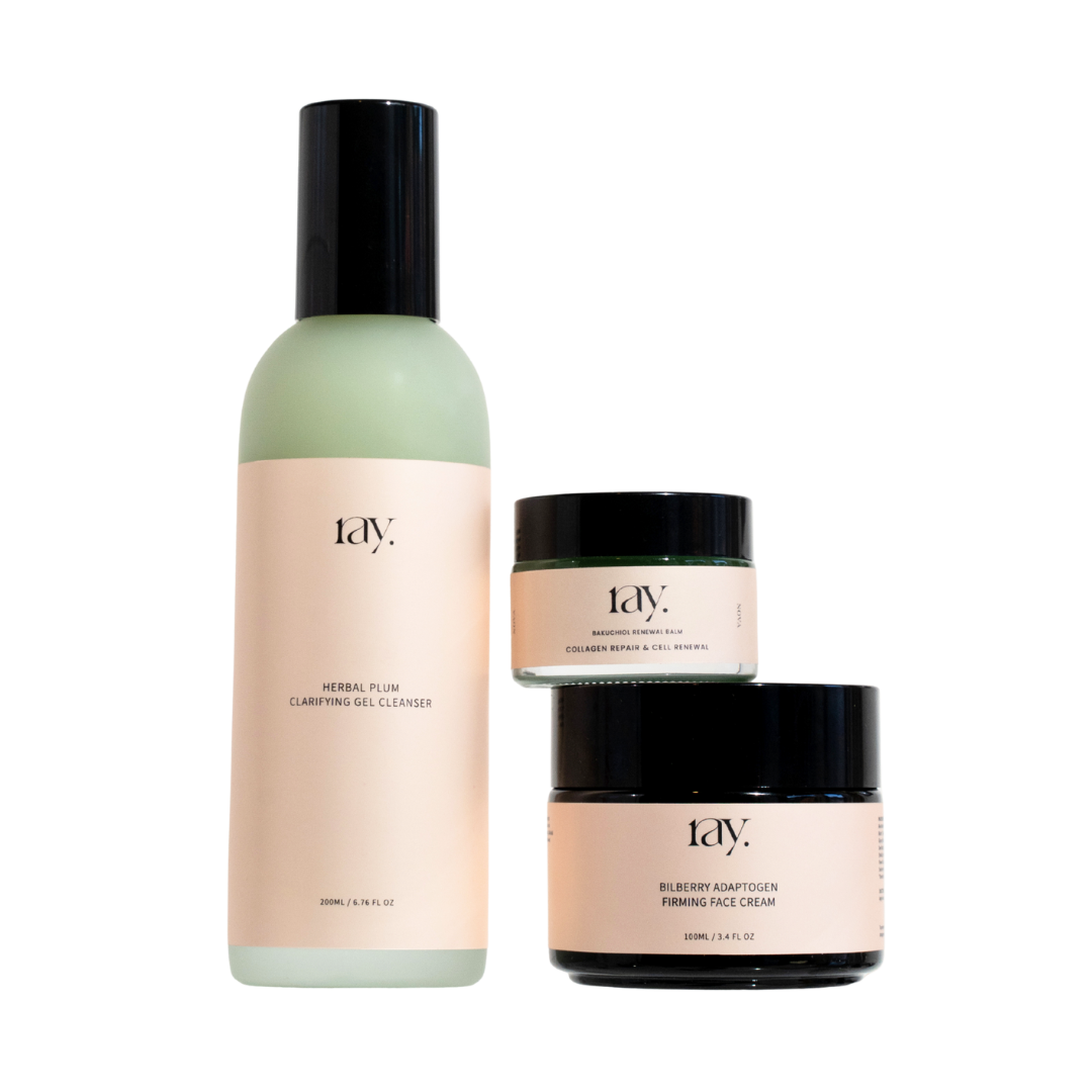 A simple 3-step ritual to restore, plump and firm your skin. Featuring our Herbal Plum Clarifying Gel Cleanser (to gently remove impurities and support your skin’s natural barrier), Bakuchiol Renewal Balm (to restore, hydrate and improve elasticity), and Bilberry Adaptogen Firming Face Cream (peptides boost firmness and smoothness for a youthful glow).