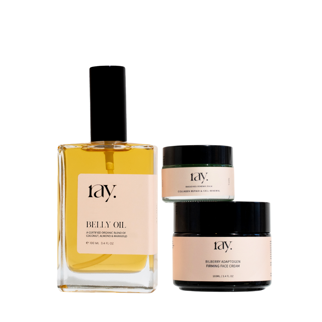 Featuring our 100ml Belly Oil (designed for stretching skin and beautiful enough to double as a nourishing oil cleanser), the Bakuchiol Renewal Balm to restore and support elasticity, and the Adaptogen Firming Face Cream to help maintain softness, firmness and hydration as skin changes.
