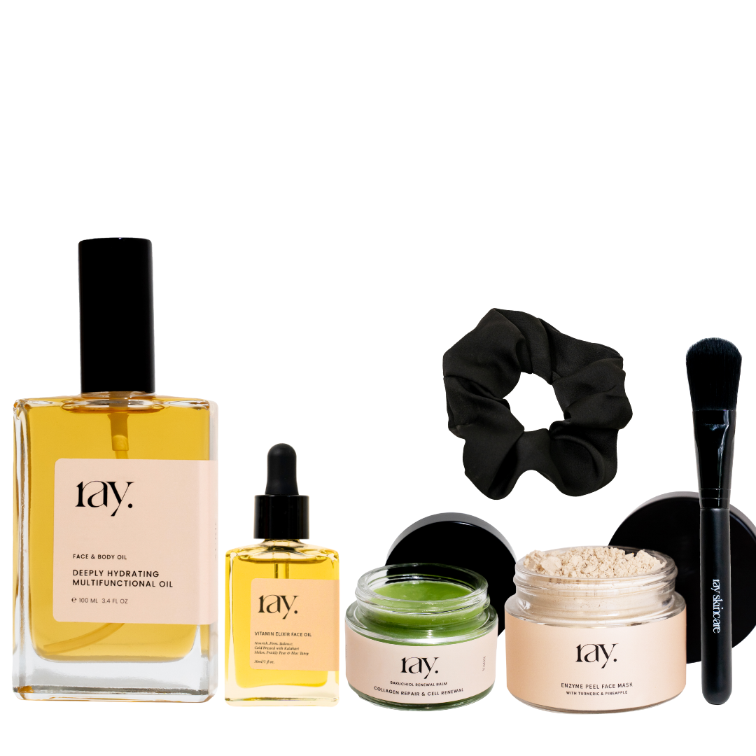 This limited edition bundle includes everything you need to restore hydration, smooth texture, and revive radiance from head to toe. This thoughtfully curated kit includes our Enzyme Peel Face Masks, Auric Body Oil, Vitamin Elixir Face Oil, and Bakuchiol Renewal Balm + a free scrunchie and masking brush!